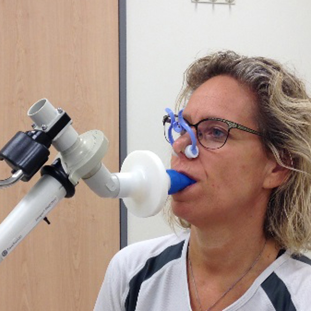 - Tijdens het onderzoek krijgt u een mondstuk in uw mond en een neusklem op. U kunt gewoon door uw mond blijven ademen.