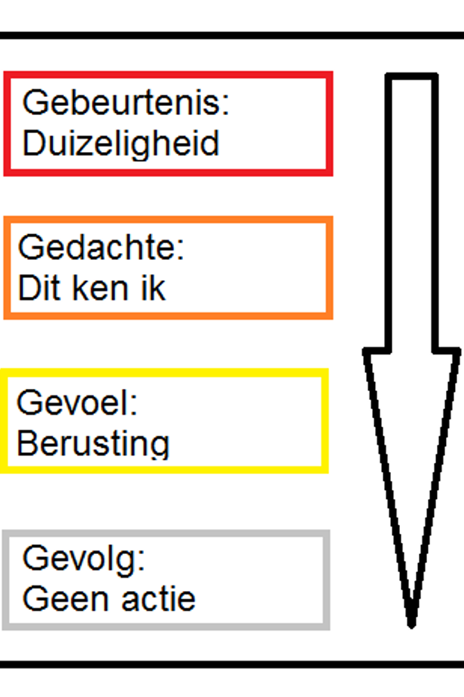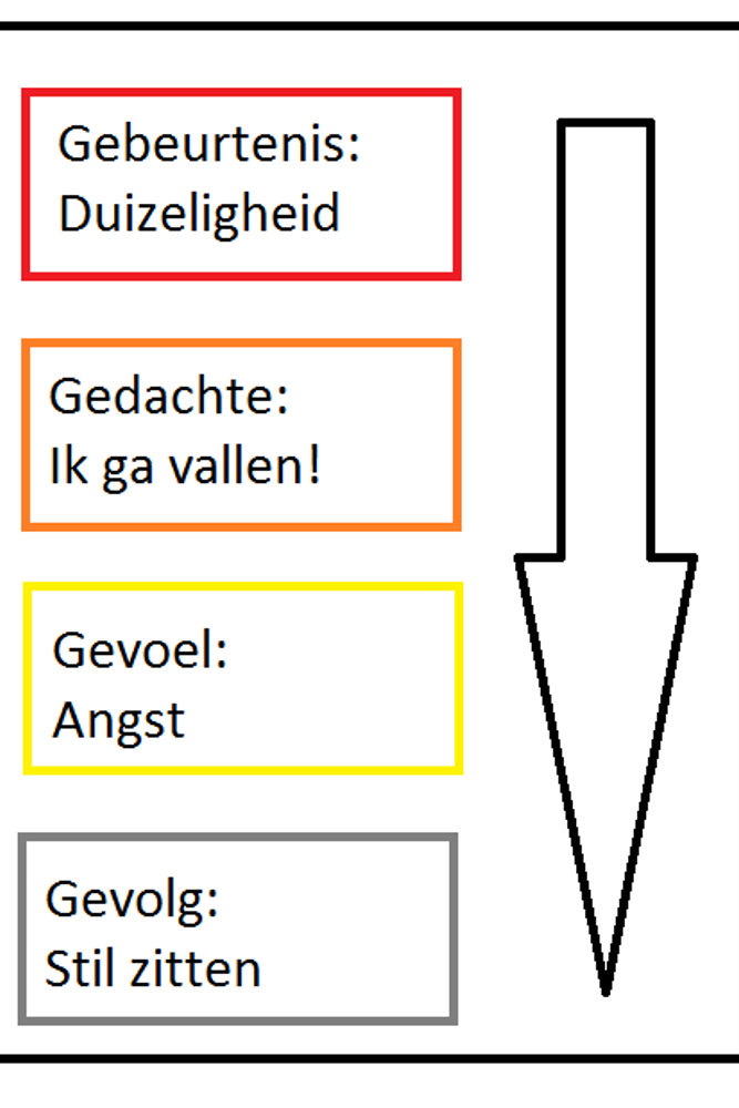 Gedachten hebben invloed op hoe u zich voelt. In de praktijk werkt dit meestal als volgt: er gebeurt iets waarbij u een bepaalde gedachte heeft. Deze gedachte leidt tot een bepaald gevoel en resulteert in bepaald gedrag.