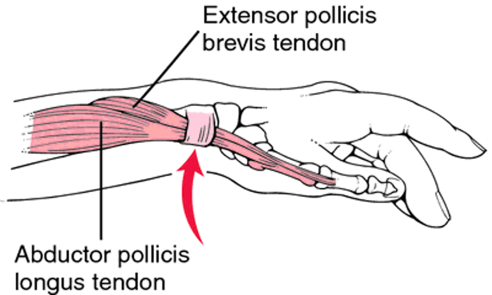 - Pijn aan de duimzijde van de pols, vaak uitstralend naar de duim of onderarm;