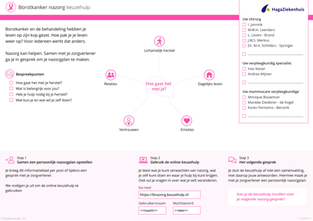 U krijgt een informatieblad ‘Nazorg Keuzehulp’ mee. Hierop staat hoe u online kunt inloggen op de digitale ‘Nazorg Keuzehulp’. In deze keuzehulp vindt u informatie en tips om verder te herstellen bij klachten. Daarnaast helpen de vragen in de keuzehulp u om na te denken over uw herstel: hoe gaat het en wat wilt u dat er verbetert?